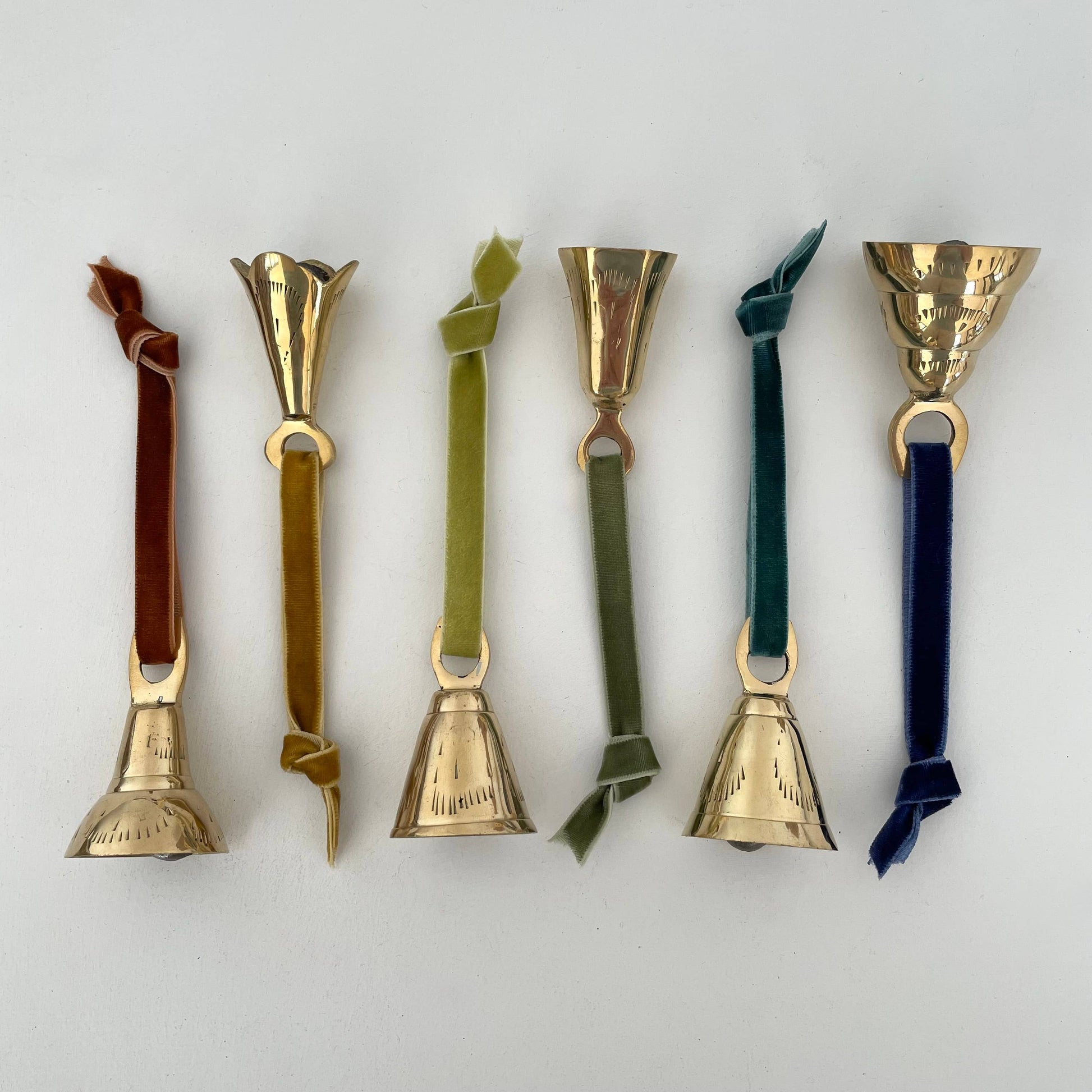 Bells are handmade in India & then strung onto velvet ribbon with a 100% polyester velvet 3/8" wide ribbon made in Vietnam. Each bell measures approx. 2 1/4"-2 1/2" from top of handle to bottom of bell and are 1"-1 1/2" in diameter, but sizes vary by shape/style. Approx. 4 1/2" L ribbon. No two bells are exactly the same. Variations expected in size, shape, finish, & color.