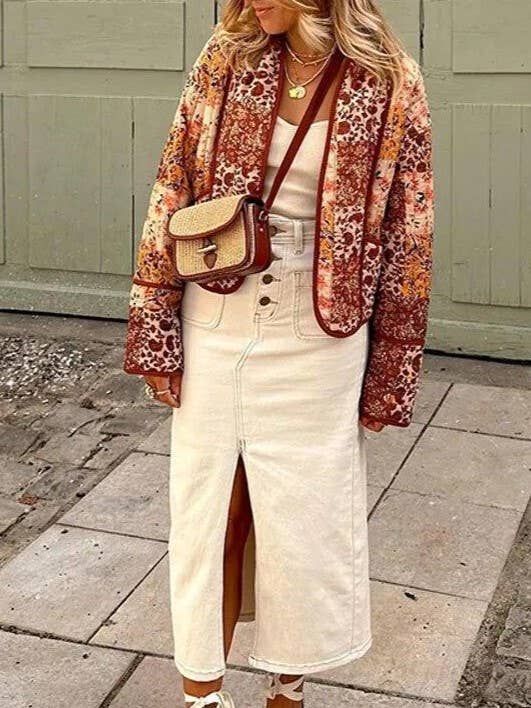 Maple Sugar Floral Patchwork Cropped Quilted Jacket: Maple / M